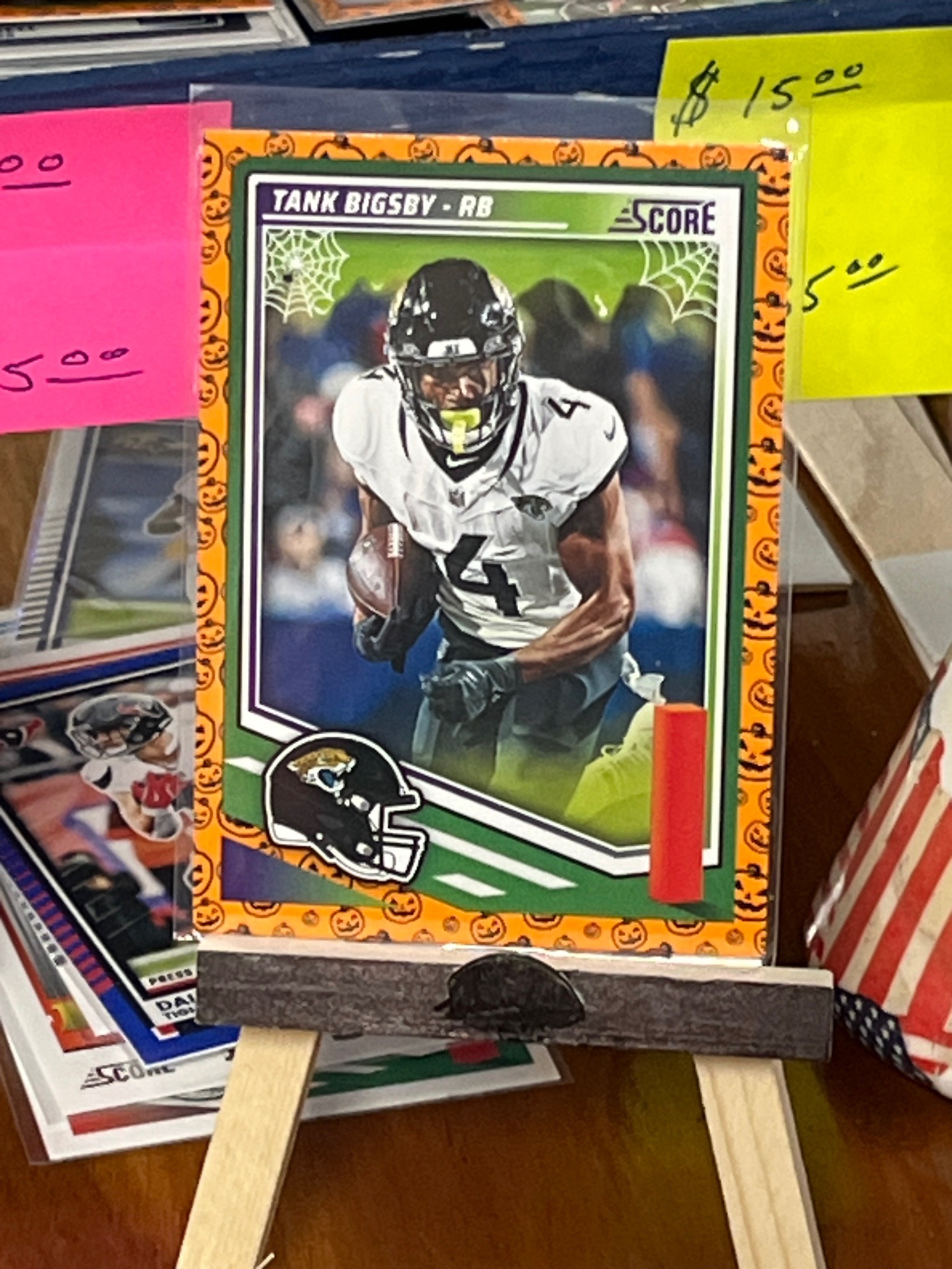 This is a 2023 Panini Score football card featuring rookie running back Tank Bigsby of the Jacksonville Jaguars. It is a specific 'Orange Pumpkin' retail parallel, characterized by a vibrant orange border pattern filled with jack-o'-lantern illustrations and spiderweb motifs in the upper corners of the inner green frame. The card is standard size (2.5 x 3.5 inches) and constructed from laminated cardstock. The central image shows Bigsby in his white Jaguars away jersey, number 4, carrying a football. The bottom left features a Jaguars helmet icon, and the top right bears the 'Score' brand logo. Notable for its holiday-themed aesthetics, the card is housed in a flexible protective clear sleeve. Visible condition appears to be 'near mint' with sharp corners and clean edges, though the centering on the orange border appears slightly shifted towards the right. This modern trading card is a product of Panini America and represents the player's rookie year (2023).