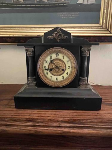This is a classic architectural-style mantel clock, often referred to as a 'Black Mantel' or 'Adamantine' clock, likely dating from 1880 to 1910. The case is constructed with a dark finish, possibly black-lacquered wood or Adamantine veneer, meant to mimic slate or marble. It features a rectangular tiered base and a pediment top adorned with an ornate bronze or brass-toned scrolled applique. The central clock face is flanked by two fluted Corinthian-style columns with metallic-finished capitals and bases. The round dial features an ivory-colored chapter ring with Arabic numerals, an ornate brass-toned center disc with scrolled patterns, and a decorative pressed metal bezel. Two winding holes are visible, suggesting an eight-day movement with a chime or gong striking mechanism. Regarding condition, the piece shows significant age-related wear; there is visible dust accumulation, surface grime, and oxidation on the decorative metal elements. Small chips and abrasions appear on the black finish, particularly along the sharp edges of the base and pediment. The glass covering the dial appears intact, though the hands show slight signs of surface patina. No specific maker's mark is visible on the front, but this style was characteristic of major American manufacturers such as Seth Thomas, Gilbert, or Ansonia. The craftsmanship is typical of high-volume Victorian-era production, emphasizing neoclassical architectural aesthetics.