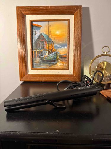 This is a contemporary hair styling tool, specifically an electric flat iron or hair straightener, finished in a matte black polymer casing. The device features a cylindrical handle design transitioning into two heated plates. It includes a thumb lever for precision opening and closing of the plates, suggesting a spring-loaded mechanism typical of mid-to-high-end styling tools. The surface is marked with various regulatory and certification icons, including the FCC mark, CE marking, and a WEEE 'do not dispose' symbol, indicating adherence to international safety and electronic standards. A series of small ventilation holes or decorative indentations run along the upper housing to assist with heat dissipation. The item is wired with a heavy-duty black power cord featuring a reinforced swivel base to prevent tangling during use. The overall condition appears to be excellent and modern, with no visible signs of melted plastic, frayed wiring, or significant surface scratching. The craftsmanship indicates a retail-grade consumer electronic device designed for ergonomic ease of use and consistent thermal performance.