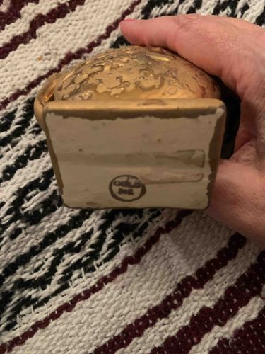 A decorative ceramic object, likely a small vase or figurine pedestal, featuring a distinctive 'weeping gold' or 'lava gold' glaze finish. The item is constructed from white ceramic/porcelain, visible at the unglazed rectangular base which measures approximately 2.5 to 3 inches in width. The upper portion is heavily coated in a textured, iridescent metallic gold finish that creates an organic, bubbled, and dripping aesthetic characteristic of mid-20th-century decorative arts. The glaze shows a high reflective quality with notable relief. On the unglazed bottom, there is a circular ink stamp or maker's mark consisting of stylized text within a ring, though it is partially obscured and difficult to read. The condition shows significant signs of age and handled wear; notably, there is visible gold loss and chipping along the edges of the base where it meets the unglazed bottom, exposing the white ceramic body. Some brownish discoloration or residue is present on the underside, possibly remnants of an old adhesive label or inventory tag. Based on the glaze style and construction, this piece likely dates to the 1950s or 1960s, a period when manufacturers like McCoy or Kingwood Ceramics popularized this heavy gold-dripping technique.