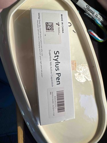 This item is a commercially packaged active capacitive stylus pen, specifically designed for use with tablet devices such as the iPad. The packaging is a rectangular white cardboard box featuring black printed text and barcodes. It is explicitly labeled as 'Made in China' and identifies the product as having a 'Superfine Nib.' The exterior of the box contains usage instructions, noting that a button must be pressed for on/off functions and that LED indicators signal charging (red) and full power (green). The box includes a retail barcode with the SKU 'X003V0TPPJ' and an additional QR code seal, likely for security or verification purposes. Physically, the item is in its retail packaging, which appears relatively clean but shows minor signs of handling and shelf wear at the corners. The product inside is an electronic peripheral designed to mimic the feel of a real pen on touchscreen surfaces. Based on the branding and labeling, this is a contemporary, third-party electronic accessory produced within the last 2-5 years. The manufacturing process involves mass-produced plastic and electronic components common in modern consumer tech accessories.
