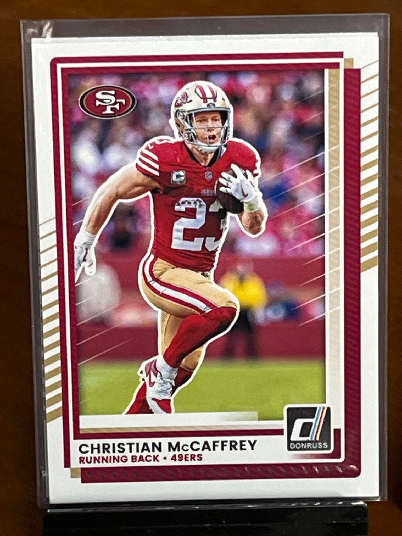 This is a 2023 Donruss football trading card featuring star running back Christian McCaffrey of the San Francisco 49ers. The card displays a dynamic action shot of McCaffrey in his red 49ers home jersey and gold pants, clutching the football while in mid-stride. The card design utilizes the classic 2023 Donruss aesthetic, characterized by a white border surrounding a maroon and gold inner frame with diagonal line patterns on the sides. The San Francisco 49ers 'SF' logo is positioned in the top left corner, while the 'Donruss' brand logo is located at the bottom right. The player's name and position are clearly printed in a bold, sans-serif font at the bottom. Measuring the standard sports card size of 2.5 by 3.5 inches, the card appears to be in excellent condition, housed within a clear protective plastic top-loader and an inner soft sleeve. The centering appears slightly heavy toward the left margin, but the corners and edges, as viewed through the case, seem crisp and free of obvious dinging or whitening. The surface glossy finish shows no visible scratches or scuffing in the provided image. This card represents a modern 'base' card from one of the most popular mainstream annual sets produced by Panini America.