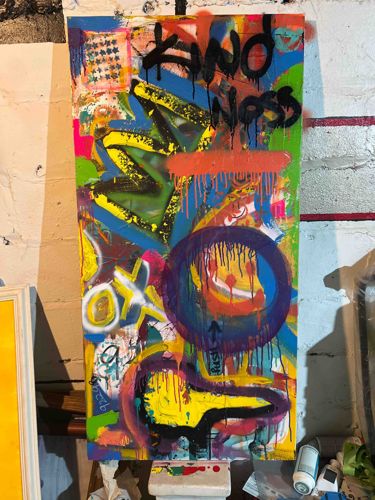 This contemporary mixed media artwork by EWHOLLEY is executed on a large-format, vertical oriented gallery-wrapped canvas. The piece utilizes a vibrant, high-contrast palette including electric blue, neon yellow, lime green, and saturated magenta, set against heavy black and white accents. Technically, it incorporates several layers of urban-inspired media such as spray paint with visible drips, acrylic washes, and heavy-duty marker work. The composition is anchored by the word 'KINDNESS' rendered in a loose, graffiti-style script at the top. Central imagery includes a distorted purple circle containing a 'smiley face' motif characterized by orange and red vertical drips, alongside various abstract symbols, 'X' marks, and numeric sequences near the left edge. The construction is robust, featuring paint that extends around the edges of the canvas, which is consistent with its production less than six months ago. The condition is excellent with no visible fading, cracking, or surface abrasions, reflecting its status as a recent studio work. The craftsmanship demonstrates a deliberate 'ordered chaos,' blending elements of neo-expressionism and pop art into a cohesive street-style aesthetic typical of the artist's current portfolio.
