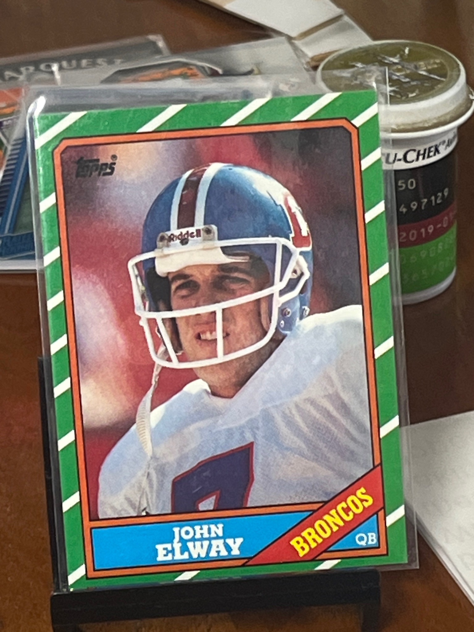 This is an original 1984 Topps football card featuring Hall of Fame quarterback John Elway. The card is printed on standard 2.5 x 3.5 inch cardboard stock common for the era. The design features a green outer border with white diagonal stripes, a unique aesthetic specific to the 1984 Topps football set. The central image is a portrait shot of Elway in his Denver Broncos uniform, wearing a blue Riddell helmet with a white facemask. The 'Topps' brand name is visible in the upper left corner of the photograph frame. At the bottom, a blue name bar identifies him as 'JOHN ELWAY' alongside a red diagonal banner text 'BRONCOS' and a small blue 'QB' designation. The card appears to be housed in a protective plastic sleeve and top-loader. Upon close inspection, the centering appears slightly shifted toward the top-right. The corners show some very minor softening, typical of an ungraded card from this period, but the surface gloss remains largely intact. There are no significant creases or surface flaws visible in the high-resolution image, though some 'snowing' (tiny white print dots) is present in the darker areas of the photo, which is a common manufacturing characteristic of this specific 1984 production run. The color saturation is strong, with the orange and blue of the Broncos' identity remaining vibrant.