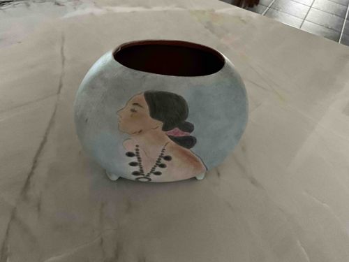 This is a hand-painted ceramic vessel featuring a squash or ovoid form with a wide, open rim. The piece is constructed from earthenware or stoneware and sits on integrated small feet or a slightly raised base. The exterior is finished with a textured, light blue or pale grey slip or wash, providing a matte background for the central figural motif. The painting depicts a woman in profile, stylized in a folk art manner, with dark hair pulled back and detailed jewelry resembling a squash blossom or beaded necklace. The woman's skin is rendered in warm tan tones with a hint of pink in her hair wrap. The interior appears to be a natural terracotta or unglazed clay. Notable characteristics include the slightly asymmetrical, hand-built shape and the visible brushwork in the background. Condition-wise, the piece shows some light surface scuffing and minor pigment thinning consistent with a mid-to-late 20th-century decorative object. There are no immediate signs of large cracks or repairs visible from the primary angle, though the matte finish is susceptible to handling marks. This item reflects a contemporary folk art style, likely artisan-made rather than mass-produced, and lacks a visible signature in the provided view.