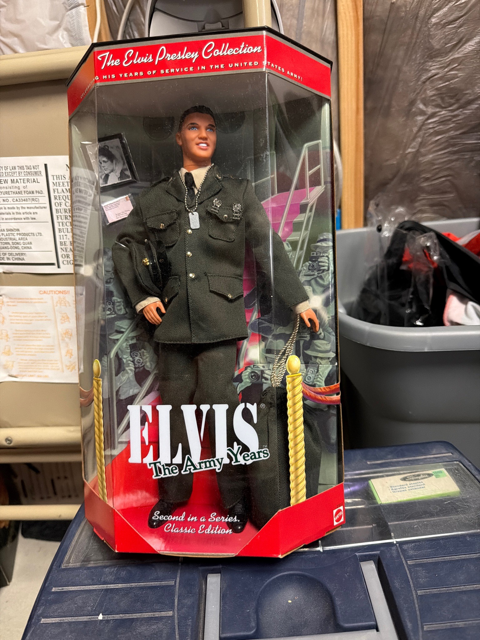 This is a collectible fashion doll manufactured by Mattel, part of 'The Elvis Presley Collection' commemorating his military service. The doll is approximately 12 inches tall, constructed of molded vinyl and plastic with a painted facial sculpt capturing Elvis's likeness. He wears a detailed scale-model reproduction of the United States Army Class A olive drab uniform, featuring a four-pocket tunic with miniature gold-tone buttons, silver-tone insignia, and a black tie. Notable accessories include a silver-tone dog tag necklace and a duffel bag. The item is housed in its original window box packaging, which features red and black graphics and a clear plastic display panel. The packaging identifies this as the 'Second in a Series' and a 'Classic Edition.' The background art inside the box depicts a crowd of paparazzi, adding to the thematic 'celebrity' feel. The doll appears to be in 'Never Removed From Box' (NRFB) condition, preserved in its original factory state. No visible fading, mold, or structural damage is observed on the figure itself. The exterior cardboard shows minor shelf wear at the corners, which is typical for items of this age, likely dating from the late 1990s (approx. 1999). Mattel's logo is clearly visible on the lower right corner, ensuring brand authenticity.