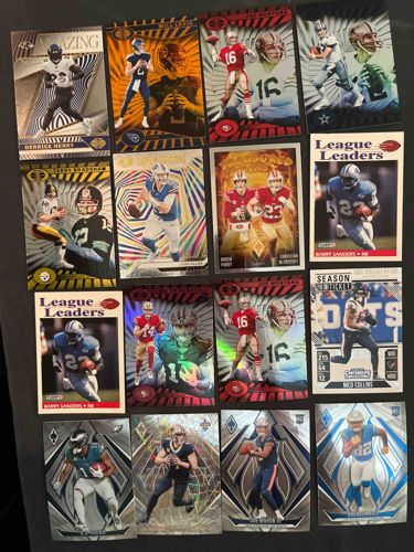 This is a diverse collection consisting of 15 modern American football trading cards, primarily featuring standout inserts and parallels from the early 2020s. The lot includes high-gloss refractive chrome cards from the Panini Illusions, Panini Phoenix, and Panini Contenders lines. Notable veteran cards include two Joe Montana 'Illusions' red parallels, a Terry Bradshaw 'Illusions' gold parallel, and two Score 'League Leaders' Barry Sanders cards featuring a classic retro design. Newer stars and rookies are also represented, such as Josh Allen in a 'The Gamers' insert, Brock Purdy paired with Christian McCaffrey on a 'Measured Greatness' dual card, and Nico Collins on a 'Season Ticket' design. The physical construction varies from standard cardstock to premium thick-gauge chromium materials with holographic finishes. Visual conditions appear generally good with sharp corners visible on many of the chromium cards; however, without individual sleeves or top-loaders, minor surface scratches (common for refractive cards) and slight edge wear may be present. The color palette across the lot is vibrant, utilizing metallic foils, rainbow prisms, and high-saturation team colors typical of modern Panini production.