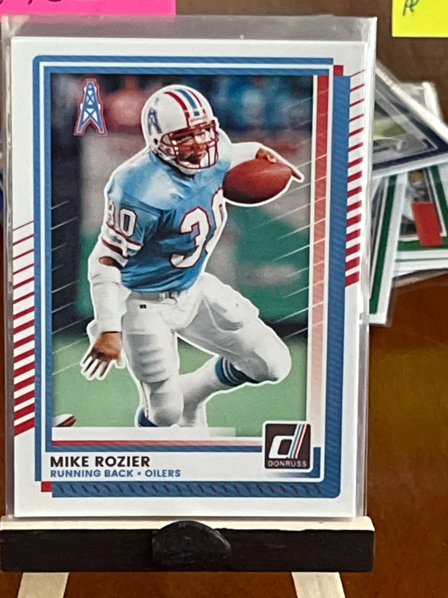 This is a standard-sized trading card (2.5" x 3.5") featuring Mike Rozier of the Houston Oilers. The card design is characteristic of the 1990 Donruss football set, featuring a white border with a bold blue inner frame. Distinctive red and white diagonal stripes are located on the left and right segments of the frame. The card front displays a full-color action photograph of Rozier in his "Columbia Blue" Oilers uniform, holding a football. The Houston Oilers oil derrick logo is visible in the upper left corner, while the classic 'D' Donruss logo is set in the bottom right. The player's name, 'MIKE ROZIER', and position/team, 'RUNNING BACK • OILERS', are printed in a clean sans-serif font along the bottom. The card stock is a typical semi-gloss paperboard. Regarding condition, while the card is housed in a clear protective plastic sleeve, the top edge appears to have slight centering issues, with the top white border being significantly thinner than the bottom. The corners appear relatively sharp through the sleeve, with no obvious creasing or surface scratching visible on the front face. This mass-produced card from the 'junk wax' era remains a nostalgic piece for Houston Oilers fans and collectors of Heisman Trophy winners.