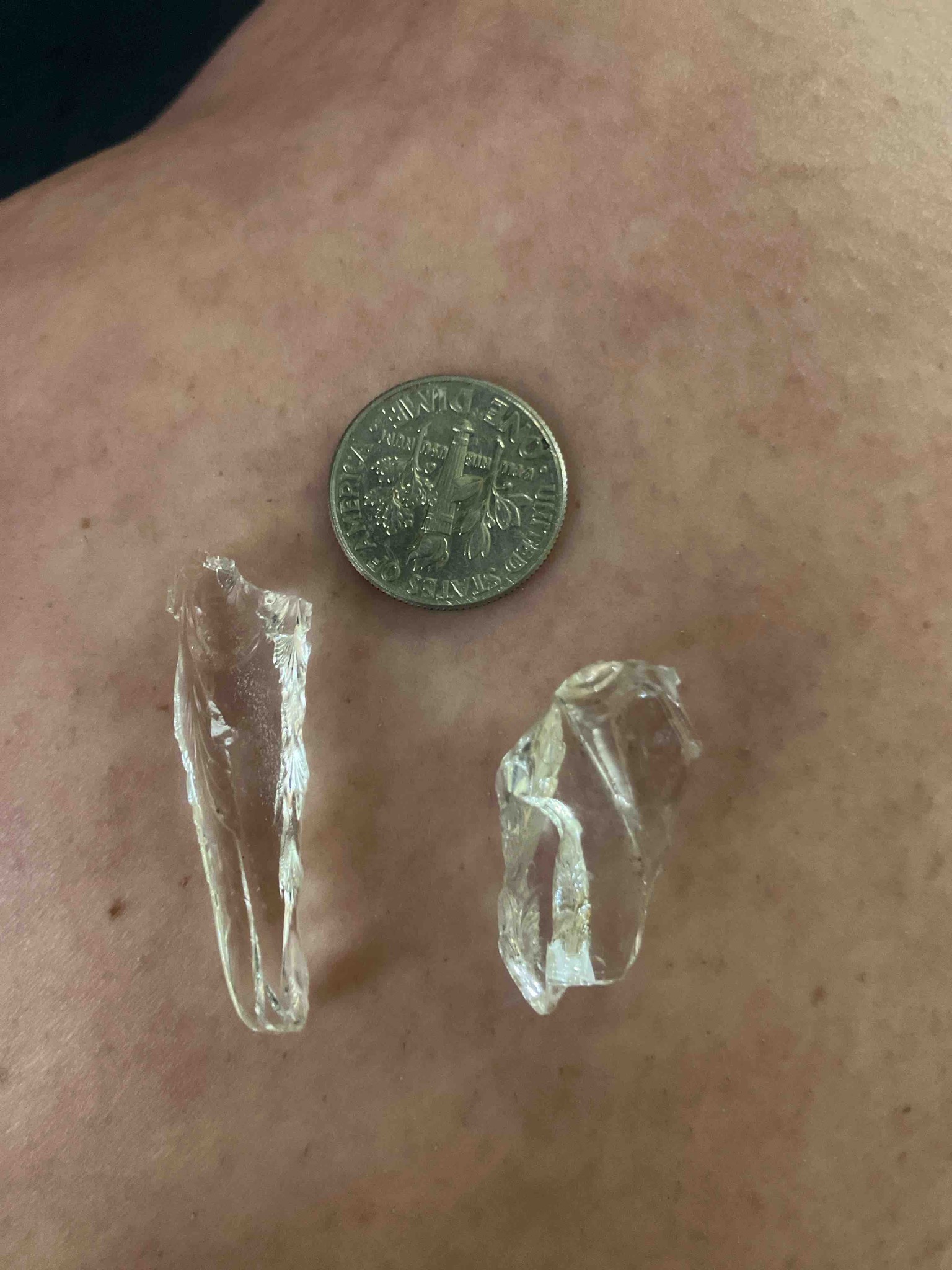 These specimens consist of two distinct lithic flakes produced from high-quality, transparent rock crystal quartz. In the context of Caddoan archaeology, such material is highly significant, often sourced from the Ouachita Mountains of Arkansas and utilized for the production of prestige items or specialized projectile points. The larger flake on the left is elongated, measuring approximately 1.5 inches in length, and exhibits clear conchoidal fracturing with prominent ripple marks and a sharp, feathered edge. The smaller flake on the right is more irregular in shape and displays complex negative bulb scars from previous flake removals. Both pieces are water-clear with exceptional translucency, characteristic of premium grade quartz used by Mississippian-era cultures. There are no visible intentional retouchings on these specific pieces, suggesting they are debitage or 'waste flakes' from the knapping process of a larger tool. The edges show minor micro-chipping, which could indicate post-depositional wear or use as expedient scraping tools. Their association with Caddoan culture suggests an estimated age spanning from approximately 800 to 1400 CE. The craftsmanship resides in the choice of material, as working with brittle quartz crystal requires a high level of technical skill to avoid shattering while producing usable blades or bifaces.