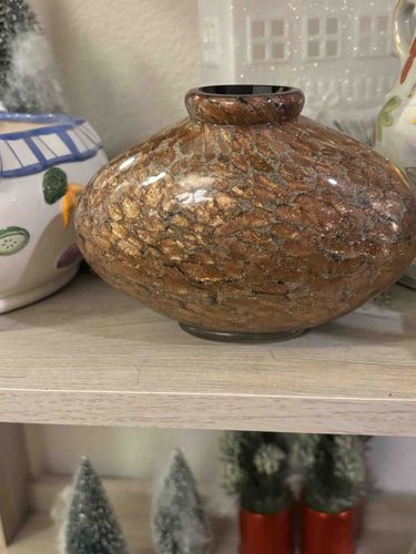 This is a hand-blown glass bud vase featuring a flattened ovoid or 'lentil' shape with a short, rounded rim and a small circular base. The piece is characterized by its complex decorative technique, reminiscent of Venetian Murano glass. It displays an amber or deep bronze ground heavily infused with 'aventurine' or copper-gold metallic inclusions that create a shimmering, speckled, or 'scavo' effect across the surface. The texture appears slightly mottled with dark webbing or veins that separate the metallic flecks, suggesting a layered or cased glass construction. The interior appears to be a solid dark glass, possibly black or deep amber. While no maker's mark is immediately visible in the provided view, the style is consistent with mid-to-late 20th-century decorative art glass, often produced in Italy or inspired by those traditional techniques. The craftsmanship shows high quality in the distribution of the metallic leaf and the symmetrical bulbous form. The condition appears excellent with no visible chips, cracks, or significant surface abrasions, maintaining a high-gloss finish that reflects the light well. This type of glasswork is often valued for its light-catching properties and organic, stone-like aesthetic.