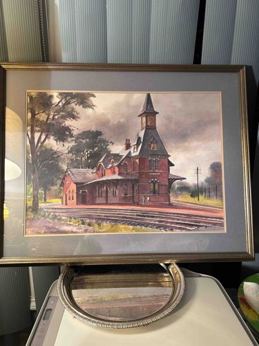 This item is an original watercolor painting depicting the historic Point Pleasant, New Jersey train station. The artwork is rendered in a traditional, representational style, showcasing the Victorian Gothic architecture of the red-brick station building, complete with its prominent clock tower and steep-pitched roof. The color palette is dominated by earthy reds, muted greys in the overcast sky, and natural greens from the surrounding foliage. The foreground features the railroad tracks, while several small figures are visible on the platform, suggesting a lived-in, atmospheric scene. The painting is professionally presented in a double mat—a subtle blue-grey over an inner cream bevel—and housed in a thin, metallic gold-toned frame under glass. Based on its stylistic qualities and the framing materials, the piece likely dates from the late 20th century. The brushwork shows a confident hand, particularly in the rendering of architectural shadows and the soft, blended textures of the clouds. While the condition appears good from the image, there is minor dust under the glass and some slight aging to the frame's finish. No visible artist signature is clearly identifiable at this distance, but the level of detail indicates professional-grade craftsmanship.