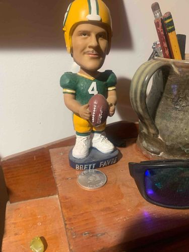 This item is a collectible ceramic or resin bobblehead figurine of NFL quarterback Brett Favre, depicted in his classic Green Bay Packers uniform. The figure stands approximately 7 to 8 inches tall and is mounted on a blue pedestal base that bears the name 'BRETT FAVRE' in white block lettering. The athlete is shown wearing the iconic yellow helmet with the 'G' logo, a green jersey featuring the number '4', and yellow football pants with white cleats. He is holding a miniature Wilson-branded football. The construction features a spring-mounted head typical of 'nodder' style collectibles. In terms of condition, the figure shows minor paint wear and dust accumulation, but no major chips or structural breaks are visible in the provided image. The paint application follows a mass-produced style with standard color blocking. While the user notes provided mentions a framed poster, this specific item is a three-dimensional sports souvenir likely dating from the peak of Favre's career in the late 1990s to early 2000s. It represents a common yet popular category of NFL licensed merchandise from that era.