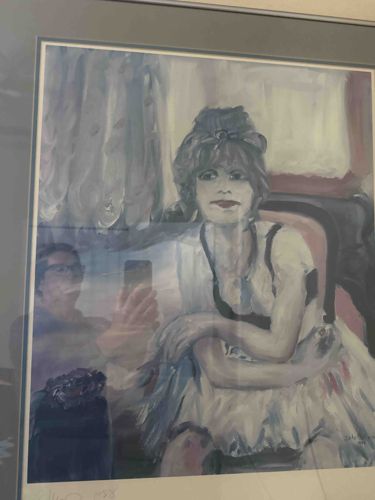 A figurative works of art, likely a lithograph or a high-quality reproduction of a painting, depicting a seated female figure dressed in a white ruffled or tutulike garment. The subject is rendered in an impressionistic or expressionistic style, with visible, broad brushstrokes and a muted color palette dominated by whites, grays, and soft blues, with touches of red for the lips and garment accents. The figure has dark, stylized hair and is posed with arms crossed. Notably, the piece is hand-signed and dated in the lower-left margin as '1988' and features a similar signature and date '1988' in the lower-right corner of the image area. The work is professionally matted with a blue inner mat and a wider white/gray outer mat, housed under glazing in a silver-toned frame. The condition of the artwork appears stable, though there is a faint horizontal crease or streak visible across the center of the image, potentially a paper wave or an artifact of the printing process. The craftsmanship suggests a limited edition or studio production from the late 20th century, utilizing a textured paper substrate that complements the painterly aesthetic of the composition.