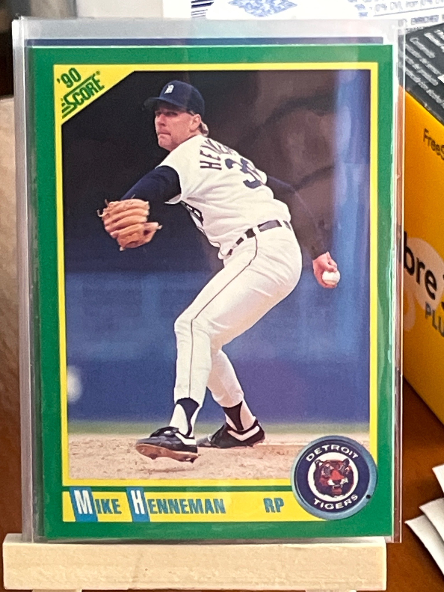 This is a standard-sized (2.5" x 3.5") baseball card from the 1990 Score set, featuring Mike Henneman, a Relief Pitcher (RP) for the Detroit Tigers. The card is identifiable by its vibrant green border and yellow inner framing. The top left corner features the '90 Score' logo in a diagonal yellow banner. The bottom right includes the classic Detroit Tigers 'D' logo with a roaring tiger illustration. The card features a dynamic action photograph of Henneman in full delivery during a game, wearing a white home jersey and blue Detroit cap. The player's name and position are printed in a stylized blue and yellow font along the bottom. The card appears to be in a protective plastic top-loader and soft sleeve. From the image, the corners show some slight softening characteristic of the mass-produced card stock of the era, and the centering seems reasonably balanced. The '90 Score set is a staple of the 'junk wax' era, known for its high production volume and glossy front finish. The cardboard stock is relatively thin compared to modern premium cards. No significant creasing or surface staining is visible, though glare on the plastic sleeve obscures the finer surface details.