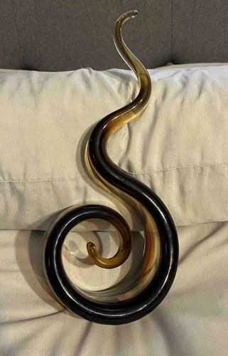 This is a striking hand-blown art glass sculpture featuring a dynamic, serpentine ‘S’ or flame-like silhouette. The piece is crafted from solid cased glass, showcasing a sophisticated smokey charcoal to amber-brown ombré color palette that transitions to clear glass at the tips. The construction utilizes a thick glass core, resulting in a heavy vertical pedestal base that curls into an elegant spiral before ascending into a sinuous, tapered peak. Its style is strongly reminiscent of Mid-Century Modern Italian glasswork, specifically the Sommerso or Bullicante techniques popularized in Murano, although it exhibits more contemporary minimalist lines. The sculpture is likely from the late 20th century (1970s-1990s). The surface appears smooth with a high-gloss finish, showing no immediate signs of chips, deep scratches, or calcification. Notable craftsmanship is seen in the perfect fluid symmetry of the curves and the absence of large air bubbles, indicating a high-quality hand-manipulated process. The base is ground flat to allow for stable upright display. There are no visible maker's marks or etchings shown, which is common for artisanal boutique glass of this era.