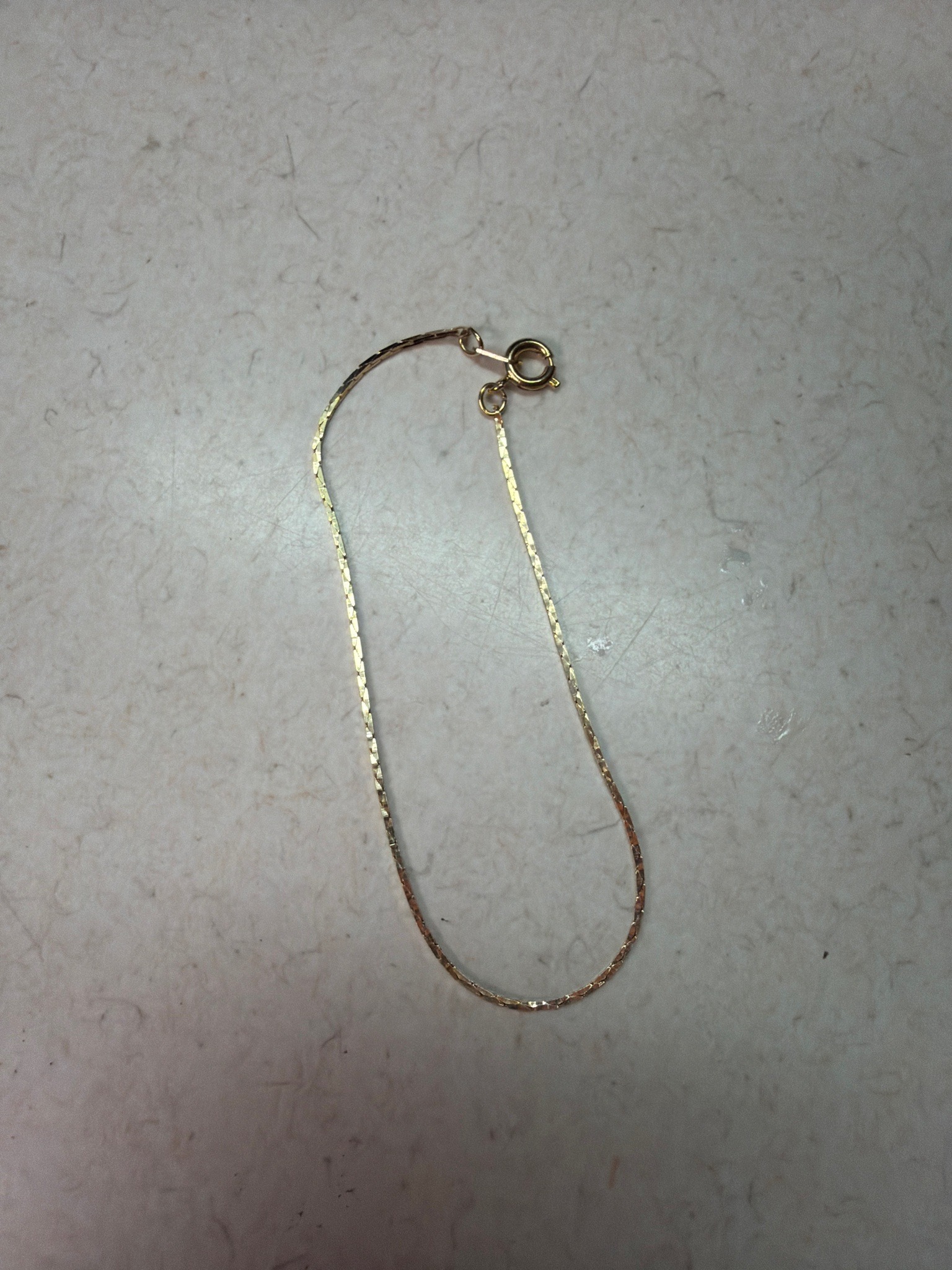 This item is a delicate, fine-link bracelet featuring a flat serpentine or herringbone-style chain construction. The bracelet measures approximately 7 inches in length and displays a bright, polished yellow gold-tone finish. It is constructed from interlocking flat metal segments that create a smooth, fluid movement, allowing the piece to sit flat against the wrist. The links feature subtle directional faceting that enhances light reflection, giving it a shimmering appearance. The closure mechanism consists of a standard spring-ring clasp attached via a small jump ring. While the resolution does not permit a definitive reading of a hallmark, there appears to be a small rectangular tag near the clasp traditionally used for manufacturer stamps or metal purity marks (such as 10k, 14k, or 'Gold Filled'). The overall condition appears excellent with no visible kinks in the delicate chain, though minor surface abrasions consistent with light wear are present. The style is classic and minimalist, likely dating from the late 20th century to the present day. The craftsmanship is precise, as evidenced by the uniform spacing of the links and the rhythmic pattern of the metalwork.