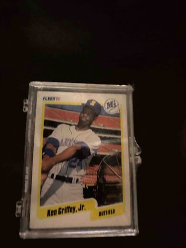 This is a 1990 Fleer baseball card featuring Hall of Famer Ken Griffey Jr. during his early tenure with the Seattle Mariners. The card depicts a classic 2.5 by 3.5 inch rectangular format, constructed from semi-gloss cardstock typical of the 'Junk Wax' era of manufacturing. The front design features a white border surrounding a yellow inner frame with a 'ribbon' detail at the bottom containing the player's name and position ('OUTFIELD'). The card displays a photograph of Griffey Jr. in his Mariners home uniform, holding a bat in a relaxed pose. In the upper left corner, the 'FLEER 90' logo is visible, while the upper right corner shows the retro circular Seattle Mariners logo. From a condition standpoint, the card is housed in a clear protective plastic case (top-loader). While a definitive grade cannot be established via photo, there is noticeable off-centering toward the right and top edges. The white borders appear bright, though there is potential softening visible on the bottom right corner of the actual card stock. This piece represents a high-volume production era in sports collectibles, known for its distinct graphic style and primary color palette of yellow, blue, and white. The craftsmanship reflects mass-printing standards of the early 1990s.