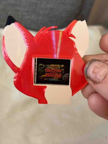 This item is a collectible film cell display featuring an original 35mm film strip snippet from the 1981 Walt Disney animation 'The Fox and the Hound'. The cell specifically features the movie's main title sequence against the forest backdrop. The film strip is housed within a custom-made, 3D-printed plastic frame shaped like the character Tod the fox. The frame displays a vibrant red-orange primary color with tan accents for the inner ears and lower face, and black tips on the ears. The 3D printing process is clearly visible via the distinct layer lines and texture patterns across the surface of the plastic. The film cell itself is rectangular and positioned in the center of the fox's face, showing the optical soundtrack on the left edge. The condition of the mount appears to be new, though it is being held by a hand with significant surface dirt. The film cell appears clear without signs of vinegar syndrome or heavy scratching, though its small size suggests it is a modern 'fan-made' or 'boutique' collectible rather than a studio-archival piece. The item represents a contemporary intersection of nostalgia and modern fabrication technology.