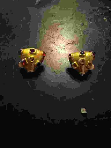 A pair of substantial, three-dimensional button earrings designed in a rich Byzantine or Renaissance-Revival style. Each earring features a domed, yellow-gold toned metal base with a matte, textured finish. They are heavily embellished with multiple bezel-set round cabochon stones in alternating colors, including deep ruby-red, sapphire-blue, and iridescent clear or white stones, likely glass or semi-precious gems like garnet and lapis lazuli. The settings are architectural and bold, with protruding bezels that add significant depth and a crown-like silhouette to the pieces. The metalwork exhibits a distinct granulated or sandblasted texture typical of high-end costume jewelry from the mid-to-late 20th century, possibly by a designer like Chanel, Miriam Haskell, or Robert Goossens. While no hallmark is visible from the frontal view, the heavy construction suggests a luxury designer origin. The condition shows minor surface wear consistent with age, with a light patina developing in the recessed areas around the stone settings. All stones appear intact, though the underlying metal may show slight brassing or oxidation upon closer inspection of the reverse. These pieces likely date from the late 1980s to early 1990s when bold, 'Byzantine' aesthetic costume jewelry was at its peak popularity.