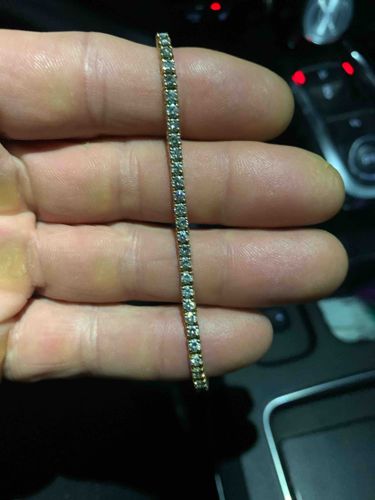 This item is a classic tennis style bracelet consisting of a single, continuous line of round-cut gemstones, likely diamonds or high-quality stimulants, individually set in a four-prong mounting. The mounting appears to be crafted from yellow gold (estimated 10k or 14k based on typical commercial standards) or gold-plated sterling silver. The gems exhibit a consistent brilliant-cut facet pattern, producing significant fire and light return under the ambient lighting. The stones are uniform in size, suggesting a total carat weight in the range of 3.0 to 5.0 carats if genuine diamonds. The construction features articulated links that allow the bracelet to drape fluidly across the hand, a hallmark of well-made tennis bracelets. The metal shows a polished finish with no immediate signs of heavy tarnishing or missing stones, though close inspection for prong wear would be necessary for a full valuation. The style is timeless, indicative of modern fine jewelry production likely from the late 20th century to the present. There are no maker's marks visible in the photograph, but the symmetry of the stone alignment indicates a professional level of craftsmanship and assembly.