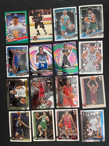 This is a diverse collection consisting of sixteen sports trading cards featuring athletes from professional baseball, hockey, and basketball. The collection showcases a blend of vintage and modern aesthetics, with cards appearing to date from the late 1980s to the 2023-24 seasons. The oldest card is a 1989 Donruss Randy Veres baseball card, identified by its vibrant green border and classic cardstock. The collection is predominantly basketball-focused, including contemporary 'Rated Rookie' cards from the Panini Donruss Optic series, such as Amari Bailey and Andre Jackson Jr. Notable modern insert sets are represented, including 'Instant Impact' and 'Silver Prizm' finishes that display a distinct holographic, refractive sheen. The cards feature standard 2.5 x 3.5-inch dimensions and are constructed from various materials ranging from traditional matte cardstock to modern high-gloss substrates and chrome-finished plastics typical of the Topps Chrome and Panini Prizm lines. Condition varies across the lot; while the modern chrome cards appear to have sharp corners and clean surfaces, some of the older or matte cards show minor signs of edge wear and potential corner softening consistent with handling. Visible brands include Donruss, Topps, Panini, and Upper Deck. The athletes represent several major franchises, including the Milwaukee Brewers, Detroit Red Wings, and various NBA teams like the Detroit Pistons, Brooklyn Nets, and Toronto Raptors.
