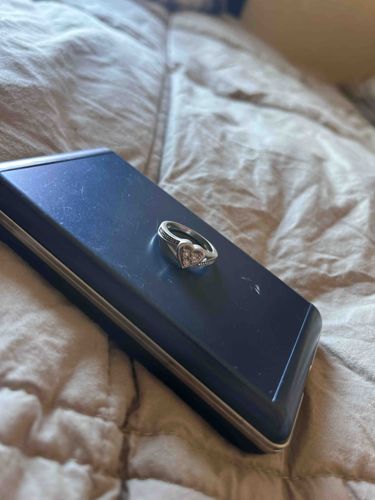 This item is a decorative ring featuring a prominent heart-shaped center motif. The piece appears to be constructed from a white-toned metal, likely sterling silver or a white gold alloy, though hallmarks are not clearly visible in the provided image. The central heart is pave-set with multiple small clear stones, which could be diamonds, white sapphires, or cubic zirconia depending on the metal quality. A notable design element is the decorative detailing along the shoulders and shank, which includes millgrain edging or small circular accents that give it a vintage-inspired aesthetic. The construction features a split-shoulder design leading up to the main heart setting, enhancing its visual presence. Regarding condition, the metal shows signs of minor surface abrasions and light oxidation typical of regular wear, but the structure remains sound with no missing stones readily apparent. The style is contemporary with romantic influences, typical of gift jewelry from the late 20th or early 21st century. The craftsmanship suggests a commercial production grade, often found in fine jewelry retailers or boutique collections. No specific maker's mark is identifiable from this angle, but the symmetry and setting quality indicates professional manufacturing and finishing.