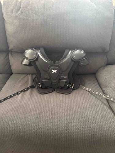 A pair of Xenith brand Pro Varsity American football shoulder pads, size Medium. The item is constructed primarily of a high-impact matte black polycarbonate or synthetic plastic outer shell, designed for professional and collegiate-level athletes. The structure features a low-profile design to allow for maximum range of motion. It includes a multi-layered foam padding system on the interior with moisture-wicking properties, and a sternum plate featuring the white 'X' logo. The shoulder caps and sub-caps are securely attached with heavy-duty rivets and flexible connectors. For adjustment, the pads utilize a belt and buckle system with reinforced synthetic straps containing metallic grommets. Notable markings include the 'XENITH' brand name on the shoulder caps and the model size 'MEDIUM' visible on the chest plate. The condition appears to be excellent and nearly new, with no significant visible surface abrasions, stress fractures, or padding deformation. The grommets on the straps show no signs of corrosion or stretching, suggesting minimal usage. These pads represent modern athletic equipment technology from approximately the last 5-10 years.
