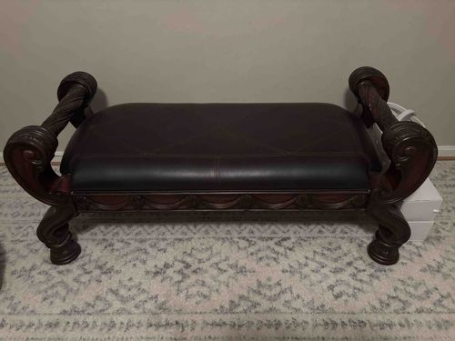 This item is an ornate entryway bench, likely constructed from a dark, rich-toned wood, possibly mahogany or a similar hardwood, finished to a lustrous reddish-brown hue. The bench features a rectangular, densely padded seat upholstered in what appears to be dark brown or black faux leather, exhibiting a smooth, slightly glossy texture and visible stitching along its perimeter, suggesting good construction. The most striking features are the intricately carved armrests and legs. The armrests terminate in substantial, scrolled forms reminiscent of classical or Baroque design, with spiral-turned pillars extending vertically towards the seat. These pillars display a rope-twist carving pattern. The legs are robust and elegantly curved, transitioning from the scrolled armrests and ending in bulbous feet, suggesting a solid and stable base. Below the seat, there is a decorative apron spanning the length of the bench, featuring a repeating carved motif of swags or scrolls, adding to its opulent aesthetic. The overall style suggests a traditional, possibly Victorian or early 20th-century revival influence, but without specific maker's marks, pinpointing an exact age is difficult. The finish on the wood appears well-maintained, with no immediately visible deep scratches, chips, or significant signs of damage, though minor surface wear consistent with age and use may be present. The faux leather upholstery also appears to be in good condition, without tears or major scuffs. The craftsmanship, particularly the detailed carving, indicates a piece designed to be both functional and decorative, suitable for an entryway, foot of a bed, or a formal living space.