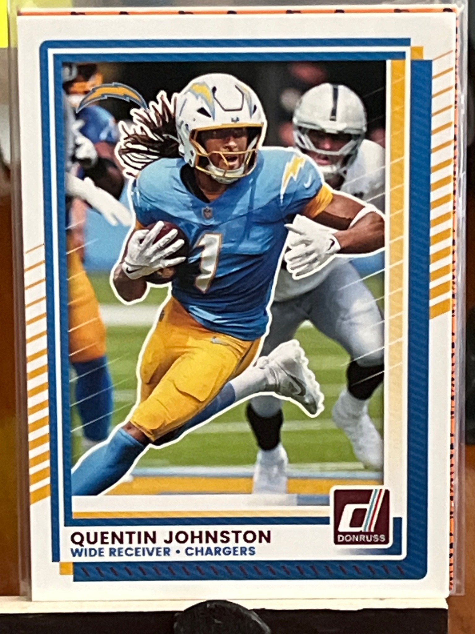 This is a 2023 Donruss football trading card featuring Quentin Johnston, a Wide Receiver for the Los Angeles Chargers. The card displays a dynamic action shot of Johnston running with the ball in his powder blue Chargers uniform. The physical dimensions are the standard trading card size of 2.5 by 3.5 inches. The design features a white border with internal blue and yellow graphic accents that complement the team's colors. The player's name and position are clearly printed at the bottom left, while the iconic Donruss 'D' logo is positioned at the bottom right. The card appears to be in excellent condition, housed in a protective plastic sleeve which may cause slight glare in photos. The corners and edges look sharp, and the centering of the image within the white borders appears balanced. There are no visible surface scratches or creases on the front. As a 2023 release, it represents Johnston's rookie season, a key factor in the collectibility and value of modern sports cards. The print quality is high, with vibrant colors and crisp detailing on the player's equipment and jersey.