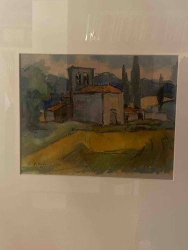 This item is an original landscape painting executed in a style evocative of Mid-Century Expressionism, likely a watercolor or gouache on paper. The composition depicts a rustic architectural setting, featuring a prominent rectangular building with a distinctive belfry or bell tower, set against a rolling countryside. The color palette utilizes earthy ochres, muted greens, and deep slate blues, with a soft atmospheric sky in the background containing hints of peach and violet tones. The brushwork is loose and gestural, prioritizing mood and form over precise figurative detail. Notable features include the rhythmic placement of vertical cypress-like trees and a walled courtyard that grounds the central structure. In the lower-left corner, there is a visible signature that appears to read 'A. Koch' or similar, accompanied by the date '55', suggesting the work was created in 1955. The painting is professionally mounted with a wide white matte and protected under glass. Visible condition appears stable within the frame; however, there is some minor yellowing of the paper consistent with age and light exposure. The craftsmanship reflects a confident hand familiar with post-impressionist techniques, particularly in the way light and shadow are blocked out to define the geometry of the architecture.