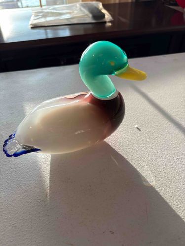 This is a hand-blown art glass figurine depicting a mallard duck in a resting 'decoy' pose. The piece exhibits characteristic mid-century Murano-style craftsmanship, utilizing a multi-layered glass technique. The head is fashioned from a vibrant translucent teal or emerald green glass, featuring an applied opaque yellow bill. A thin white ring or 'collar' separates the head from the body. The body is primarily composed of an opaque white core, overlaid with sections of translucent amber or brownish-burgundy glass at the chest, creating a gradient effect. The tail feathers are detailed with applied translucent blue glass ridges. The overall form is smooth and aerodynamic, with a weighted base common to paperweight-style glass sculptures. Physically, the item appears in good condition with no visible chips or cracks, although a small surface reflection or possible minor scratch is noted on the side. The lack of visible maker's marks suggest it may have originally featured a foil label that has since been removed. This style of glasswork was particularly popular from the 1950s through the 1970s, often produced by Italian workshops or international competitors imitating the Venetian aesthetic. The vibrant color palette and fluid lines indicate a high level of decorative craftsmanship.