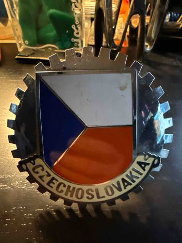 This item is a vintage emblem or badge featuring the national flag of Czechoslovakia, set within a distinctive gear-shaped outer border. The central flag design displays the iconic blue triangle on the hoist side, with white and red horizontal stripes. The colors appear vibrant, likely a combination of enamel or a resin coating over a metal base. The flag itself is framed by a thin metallic border, which then merges into a semicircular banner at the bottom that reads "CZECHOSLOVAKIA" in black sans-serif capital letters on a cream or light yellow background. The entire assembly is set against a chrome or polished silver-colored metal gear outline, characterized by sharp, uniform teeth around its circumference. The construction suggests a multi-part manufacturing process, possibly die-cast metal for the gear and banner, with enameled or epoxy-filled sections for the flag colors and lettering. The surface of the flag and banner shows some minor scuffs and a few small spots of discoloration, particularly on the white stripe and near the top edge, indicative of age and handling. There are no visible major cracks, chips, or significant repairs, suggesting it has been reasonably well-preserved for its age. The polished metal gear edges also show some minor surface imperfections and possibly light oxidation or tarnish in crevices, consistent with a vintage item. The overall craftsmanship appears solid, aiming for a durable piece, likely intended for attachment to a vehicle, piece of equipment, or as a collectible display piece. Based on the flag design and the country name, the item dates to the period when Czechoslovakia existed as a unified nation, prior to its dissolution in 1993, making it at least 30 years old, and potentially much older, possibly from the mid to late 20th century.