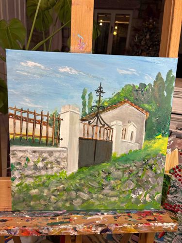 This is an original representational landscape painting executed on a square canvas, likely measuring approximately 12x12 or 16x16 inches. The medium appears to be acrylic or oil, characterized by visible, expressive brushwork and a textured application of paint. The composition features a traditional European-style estate entrance, including a white stucco wall, a stone base with variations of gray and green, and an ornate wrought-iron gate with decorative scrollwork and a cross-like finial. To the right of the gate stands a small white building or gatehouse with a terracotta-tiled roof. The background is filled with lush green cypress and deciduous trees set against a pale blue sky with wispy white clouds. The color palette is naturalistic, dominated by earthy tones, vibrant greens, and soft blues. The condition appears to be excellent and recently executed, as it is displayed on an easel with visible paint splatters, suggesting it is a contemporary work by an active artist. The technique demonstrates a loose, impressionistic style with a focus on capturing light and foliage texture rather than fine architectural detail. No visible signature is discernible from the front, suggesting it may be signed on the reverse or is still in progress.