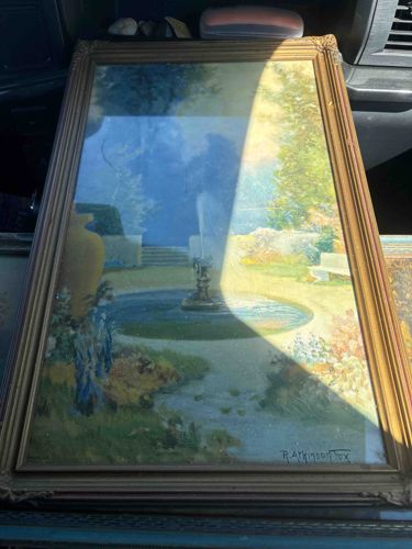 This item is a vintage color lithograph by the prolific illustrator R. Atkinson Fox (1860–1935), capturing a romanticized, tonalist garden landscape. The scene features a central tiered fountain in a reflecting pool, surrounded by lush gardens, a yellow stone urn, and classical garden architecture. The artwork is presented in its original, early 20th-century gilded gesso-on-wood frame, which displays characteristic fluted molding and ornate corner rosettes. The piece is signed 'R. Atkinson Fox' in the lower right corner. The color palette is rich with soft blues, yellows, and greens, typical of the Maxfield Parrish era. Measuring approximately 18x24 inches (estimated with frame), the condition shows significant signs of age. There is visible fading of the pigments due to light exposure and a prominent vertical white scratch or surface abrasion running through the center of the image. The frame shows minor chipping to the gesso and thinning of the gold leaf, consistent with a production date roughly between 1910 and 1930. The craftsmanship represents high-quality commercial printing of the early 20th century designed for middle-class home decor.