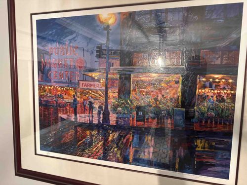 This item is a large-format, framed fine art print or lithograph depicting a vibrant nighttime scene of Seattle’s iconic Pike Place Market. The artwork features an impressionistic style with bold, expressive brushstrokes and a rich palette of blues, deep purples, and ambers. The composition centers on the glowing 'Public Market Center' neon sign, reflected on a wet cobblestone street alongside various flower stalls and figures under warm streetlights. The piece appears to be a mixed-media reproduction, possibly a giclee on paper with hand-applied texture, as visible glare on the surface suggests a gloss finish or varnish. The print is professionally mounted with a white and burgundy double mat and housed in a dark wood or laminate frame. In the lower margins, there are visible markings: a possible edition number on the left and a pencil signature on the right, suggesting it is a limited edition or artist-signed work. The condition shows minor scuffing on the frame and slight undulation of the paper under the glass, though the colors remain extremely vivid and saturated. Based on the subject and style, the work likely dates from the late 20th to early 21st century.