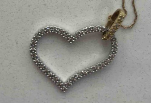 This item is a decorative open-heart pendant suspended from a fine link chain. The pendant features a classic curvilinear heart silhouette executed in a mixed-metal or two-tone aesthetic. The body of the heart is crafted from a white metal, likely 10k or 14k white gold or sterling silver, and is densely pavé-set with small round white gemstones, presumably diamonds or cubic zirconias, which cover the entire front-facing surface. The bail of the pendant provides a striking contrast, rendered in yellow gold and also featuring accent stones. The construction utilizes a prong-setting technique for the stones, which adds texture and sparkle. The chain appears to be a delicate cable or box style in yellow gold. Condition-wise, the piece shows minor surface abrasions consistent with gentle wear; the stones appear intact though a light cleaning would improve brilliance. The craftsmanship indicates a contemporary fine jewelry piece, likely produced within the last 20 years. No visible maker's marks or metal fineness stamps are identifiable from the image, but the overall design suggests a mass-market luxury style typical of retail jewelers.