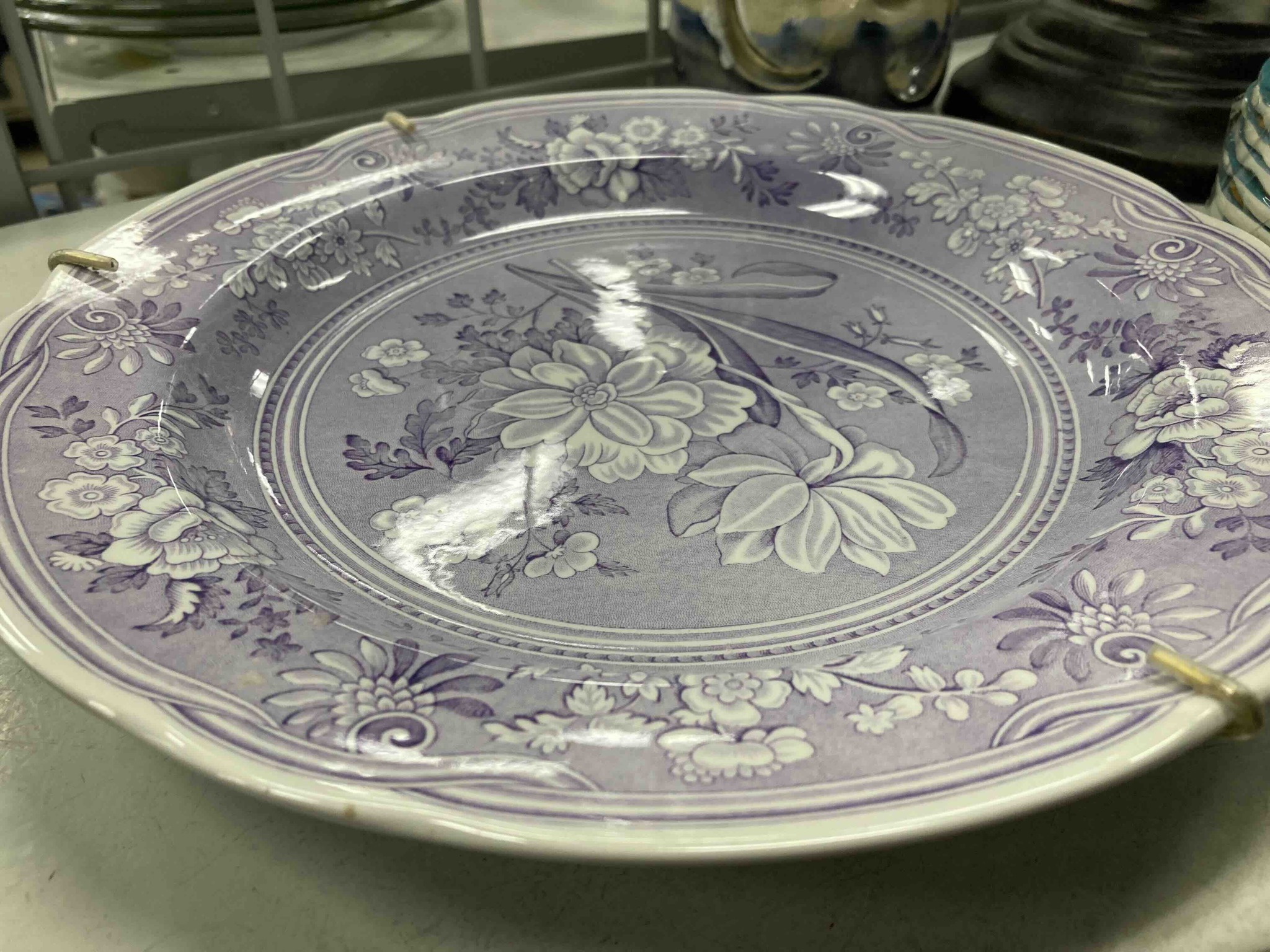 This item is a decorative dinner-sized plate from the Spode 'Botanicals' collection, featuring a classic lavender or lilac-toned transferware design on a white ceramic body. The central well of the plate is adorned with a large, intricate floral spray depicting lilies and smaller blossoms against a finely textured, cross-hatched background. This central medallion is framed by a double-beaded border. The wide rim, or marli, features a continuous scroll and floral garland motif that echoes the central theme. The plate has a scalloped edge which adds a refined, traditional aesthetic common in English earthenware from the late 20th century. Based on the Spode 'Botanicals' series, this piece likely dates from the 1990s to early 2000s. The transfer application is crisp, showing High-quality craftsmanship with consistent tonal depth. Regarding condition, the glaze appears bright with a high gloss finish, though some overhead light reflections are visible. Metal plate hangers are currently attached to the rim; while these are functional for display, the pressure points should be inspected for small chips or 'flea bites' in the glaze. No significant cracks or crazing are immediately apparent, though one small brown spot is visible on the edge at the bottom left, which may be a minor kiln mark or surface stain. The overall construction is sturdy and representatve of Spode's durable fine stoneware or earthenware production.