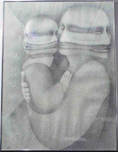 This is a monochrome, mixed-media work on paper (likely charcoal, graphite, or airbrush) presented in a simple silver-toned metal frame. The composition depicts two figures—an adult or larger entity holding a small child—rendered in a highly stylized, surrealist manner. The most striking feature is the horizontally stretched, distorted facial features of both subjects, which creates a rhythmic, wave-like effect across the eyes and mouths, suggesting movement, multi-dimensionality, or a psychological blurring of identity. The texture is characterized by a fine, stippled, or grainy application of pigment, providing a soft focus that contrasts with the sharp conceptual distortion. The palette is strictly achromatic, utilizing a range of grays from bright highlights to deep charcoals. The artist's signature or monogram appears to be present in the lower-left corner, though it remains illegible from the primary view. The work has a mid-to-late 20th-century aesthetic, reminiscent of the 'Fantastic Realism' or 'Biomorphic Surrealism' movements. The framing is functional and modern, with the glass showing significant reflections that indicate it is non-museum grade. There are no immediate signs of foxing or water damage, though the paper appears to be slightly undulated within the frame, suggesting a loose hinge-mount.
