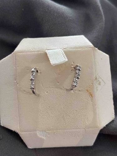 A pair of contemporary J-hoop style earrings crafted in 10k white gold. Each earring features four round brilliant-cut diamonds vertically prong-set along the front face of the hoop. The white gold setting is polished to a high luster, providing a bright, reflective backdrop that enhances the presence of the stones. The 'J' shape curves elegantly from the earlobe, creating a low-profile silhouette typical of modern jewelry design from the late 20th to early 21st century. While specific carat weight is not visible, the diamonds appear consistent in size and color. The construction utilizes multi-prong settings for each stone to ensure security. The earrings are presented on a white cardboard retail display card, which shows signs of aging including yellowing, surface staining, and peeling consistent with long-term storage or handling. The metal appears to be in good condition with no visible significant scratches or tarnish, though a 10k hallmark and maker's stamp would likely be found on the interior or post of the earrings upon macro inspection. This design is a classic example of affordable luxury fine jewelry.