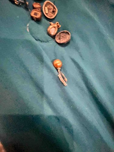 This collection consists of an assortment of vintage-style costume jewelry pieces and charms resting on a teal fabric backdrop. The most prominent items include several cast metal charms featuring relief patterns, one of which appears to be oval-shaped with an embossed classical or floral motif. The metal shows a significant aged gold-tone or brass patina with darkened recessed areas, characteristic of mid-20th-century costume jewelry. Another notable piece is a drop earring or pendant featuring a round, metallic-finished bead in a burnt orange or copper hue, suspended from a silver-toned metal component that resembles a stylized feather or a tiered tassel. The construction of the charms suggests a mass-produced casting method, likely from white metal or brass-based alloys. Visible condition issues include significant surface oxidation, tarnishing of the metallic finishes, and general wear consistent with age and frequent handling. The pieces lack visible maker's marks in this view, but the style is reflective of bohemian or novelty costume jewelry from the 1960s or 1970s. The varied textures, including the matte finish of the bead and the high-relief texture of the charms, indicate a diverse mix of materials and manufacturing styles typical of affordable vintage accessory collections.