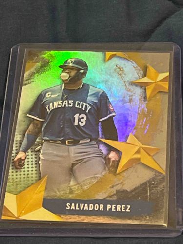 This is a 2022 Topps Fire baseball card featuring Salvador Perez of the Kansas City Royals. The card showcases a highly stylized, artistic design characteristic of the Topps Fire brand, which is known for its vibrant colors and flame-centric themes. The card features a standard 2.5 by 3.5 inch dimensions (standard trading card size) and is printed on a heavy-weight cardstock with a chrome-like, refractive finish. The image portrays Perez in a 'bubblegum' pose, wearing his Kansas City away jersey with the number 13 clearly visible. The background consists of modern, textured graphic elements including large 3D-effect gold stars and a shimmering green/gold foil effect. The name 'SALVADOR PEREZ' is printed in white block lettering on a dark blue banner at the bottom. The Topps logo is visible in the upper-left corner. The card appears to be in 'uncirculated' or 'near-mint to mint' condition, housed within a protective semi-rigid clear top-loader and an inner soft sleeve. No visible surface scratches, corner softening, or edge chipping are apparent from the frontal view, suggesting excellent preservation. This specific print run is from the 2020s modern era of sports card collecting, which focuses on high-fidelity printing and unique aesthetic overlays.