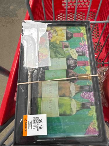 This is a contemporary two-piece appetizer set consisting of a rectangular tempered glass cheese board and a matching stainless steel spreader. The board features a vibrant, multi-colored graphic illustration of wine bottles, grape clusters, and foliage, with labels bearing the word 'CHATEAU.' The artwork utilizes a palette of greens, purples, and earthy browns against a textured glass surface designed to resist scratches. The accompanying spreader tool features a curved blade and a decorative ribbed or fluted metallic handle, likely made of a zinc alloy or stainless steel. The set is presented in its original retail packaging, which includes a black plastic base tray and a clear plastic shrink-wrap cover secured with an elastic band. Visible condition issues include significant tearing and adhesive residue on the top-left portion of the outer protective film, along with a 'Savers' thrift store price tag ($6.49) adhered to the lower-left corner. The item appears to be in unused 'New-Old-Stock' condition despite the damaged external packaging. This mass-market kitchen accessory likely dates from the early 21st century and is a functional decorative piece suitable for causal entertaining.