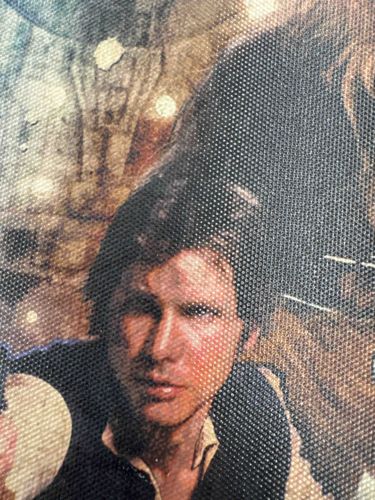 This item is a contemporary giclée-style print on a textured canvas substrate, featuring a close-up depiction of the character Han Solo (portrayed by Harrison Ford) from the Star Wars franchise. The physical construction utilizes a synthetic or cotton-blend canvas with a visible coarse weave pattern, which serves as the surface for a mechanical ink-jet printing process. The color palette consists of warm earth tones, deep blacks in the character's vest, and muted flesh tones, with a background that appears to be an artistic rendering of Chewbacca and a spacecraft interior. Notable for its 'half-tone' or pixelated appearance upon close inspection, the image demonstrates a digital reproduction technique rather than manual brushwork. The condition appears to be relatively new, though there are visible white scuff marks or scratches on the ink surface to the right of the character's face and across the lower portion of his vest, suggesting minor surface abrasion. No visible maker’s marks or artist signatures are present in this detail view. This type of mass-produced wall art is characteristic of modern fan-merchandise from the early 21st century. The craftsmanship is standard for commercial decor, intended for aesthetic display rather than high-end fine art collection.