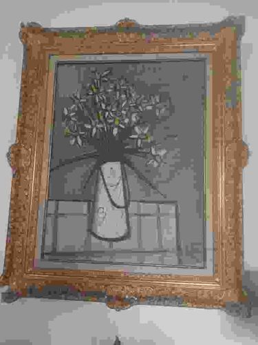 This is an oil on canvas painting by the renowned French Expressionist Bernard Buffet, dated by style and context to the 1950s. The composition features a hallmark Buffet still life: a vertical white vase with black linear detailing holding an arrangement of spiky, angular flowers against a muted, monochromatic gray background. The work exhibits the artist's signature 'miserabilist' style, characterized by stark, aggressive black outlines and a restricted palette of grays, whites, and pale yellows. The flowers are rendered with dry, sharp strokes, creating a sense of tension and melancholy typical of post-war European art. The painting is housed in an elaborate, heavy gold-gilded Louis XV-style rococo frame with ornate floral carvings and scrolls, which provides a stark contrast to the modern, minimalist aesthetic of the artwork itself. The canvas appears to maintain good tension within the frame, showing authentic aging and a subtle patina consistent with a mid-20th-century piece. Buffet's typical long, vertical signature and date are expected to be located in the upper portion of the canvas, though they are obscured by the low image resolution. The craftsmanship reflects Buffet's mastery of structural line work and his ability to evoke deep emotion through austere subject matter.
