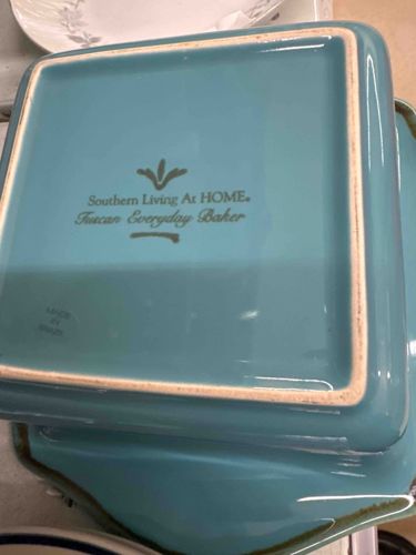 This is a square ceramic baking dish from the 'Southern Living at HOME' collection, specifically titled the 'Tuscan Everyday Baker.' The piece is finished in a vibrant turquoise or robin's egg blue glaze with a high-gloss sheen. It features a heavy, durable stoneware or pottery construction with a recessed square foot rim that is unglazed, revealing the natural off-white ceramic clay body underneath. The underside is clearly backstamped with the brand logo featuring a stylized lily-like emblem, the text 'Southern Living at HOME,' and the specific line name 'Tuscan Everyday Baker' in a cursive font. Additionally, a small stamp indicates it was 'MADE IN BRAZIL.' The edges show a slight decorative scalloped or lobed profile appearing on the side walls. Overall condition appears good with minor surface scuffs on the glaze and light shelf wear/darkening on the unglazed foot rim. This line was popularly sold through home parties in the early to mid-2000s, reflecting a rustic-contemporary style intended for both high-temperature oven use and attractive tabletop presentation.