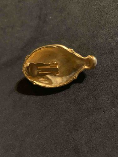 This item is a single vintage clip-on earring featuring a substantial, teardrop or bowl-shaped design with an ornate aesthetic. The piece is constructed from a cast base metal with a vibrant yellow gold-tone plating. It measures approximately 1.5 to 2 inches in length. A notable feature is the small faux-pearl or white cabochon accent seated at the narrow 'neck' of the piece. The interior exhibits a textured, hammered, or 'nugget' finish, while the exterior edges show raised, decorative scrollwork or granulation. The earring uses a classic tension-based paddle-back clip mechanism, which appears to be in functional condition. Regarding its condition, there is visible surface wear to the gold plating, particularly in the recessed areas where dark patina and oxidation have settled, suggesting a late 20th-century vintage (likely 1980s or 1990s). There are no immediately visible maker's marks or signatures on the interior of the bowl or the clip, which is common for mass-market costume jewelry from brands like Monet or Trifari. The craftsmanship is heavy and robust, characteristic of high-end costume jewelry meant to mimic the style of Etruscan or Byzantine period finery.