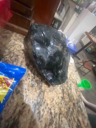 This is a substantial specimen of natural black obsidian, a volcanic glass formed by the rapid cooling of silica-rich lava. The piece displays a deep, lustrous jet-black color with a glassy, vitreous surface that reflects light significantly. It features classic conchoidal fracturing, characterized by smooth, curved, shell-like surfaces with sharp edges, indicating its high silica content and lack of crystalline structure. The specimen is irregularly shaped and appears to be an unworked, raw nodule or large chunk. It shows several deep indentations and ridges formed during its natural cooling or extraction. Based on its appearance on a standard countertop, this is a heavy, large-scale piece, likely several kilograms in weight. There are visible surface scuffs and minor chipping on some of the sharper edges, likely from handling or transport, which is common for such brittle material. No specific maker’s marks or signatures are present as it is a natural geological object. The specimen's high gloss and deep opacity suggest a high-quality mineral example, potentially suitable for lapidary work, decorative display, or metaphysical use. Its age is geological, though it was likely collected in the modern era.