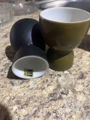 A pair of Mid-Century Modern double-sided ceramic egg cups, likely produced in Japan during the 1950s or 1960s. One piece features a matte black 'satin' exterior glaze, while the other displays a glossy olive green or harvest gold glaze. Both items are constructed from white porcelain with a high-gloss white interior glaze. These cups are designed with a pedestal hourglass or chalice shape, allowing them to be utilized from either end, potentially to accommodate eggs of different sizes (e.g., chicken vs. duck) or simply as a stylistic reversible choice. The matte black cup retains a rectangular foil label on the inner rim of the base, which reads 'ATC JAPAN', suggesting the distributor or manufacturer. In terms of condition, the pieces show evidence of use including minor surface scuffs on the matte finish and light shelf wear on the footed rims, but they appear free of major chips, cracks, or crazing. The craftsmanship reflects the clean, minimalist aesthetic characteristic of Japanese export porcelain from the post-war era, emphasizing functional geometry and contrasting textures between the exterior and interior surfaces.