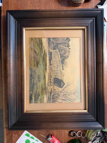 This item is a vintage framed print or lithograph depicting a classic American rural scene centered on a wooden covered bridge. The artwork features a muted color palette consisting primarily of earthy browns, faded greens, and sepia tones, suggesting a mid-20th-century production. The landscape shows a sprawling field leading to a densely wooded area, with the bridge serving as a focal point in a three-quarter perspective. The print is housed behind glass in a substantial, multi-tiered wooden frame with a dark espresso or walnut-stained finish. The frame’s construction includes a thin metallic gold-tone inner fillet that provides a highlight between the artwork's matting and the darker wood. The matting itself appears to be a neutral tan or beige cardstock. Regarding condition, the frame shows minor surface abrasions and dust accumulation consistent with age. There is visible discoloration or 'mat burn' around the edges of the print, and the paper shows slight yellowing, which is common for older paper-based collectibles. While no signature is clearly legible in the image, the style is characteristic of American regionalist prints from the 1940s to the 1970s. The overall craftsmanship of the frame is robust, featuring mitered corners and deep-profile molding that adds significant visual weight to the piece.