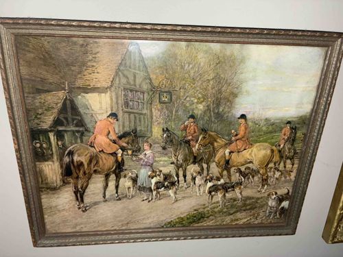 This item is a framed illustrative print depicting a traditional English fox hunting scene, likely a mid-20th-century reproduction of a 19th-century aesthetic. The artwork features four huntsmen in scarlet 'pinks' mounted on horses, congregating outside a timber-framed Tudor-style inn. A barmaid in a purple bodice and apron serves a stirrup cup to the foremost rider. The foreground is populated with a pack of foxhounds (beagles or harriers) in varying poses. The palette is dominated by earthy browns, greens, and muted skies, with high-contrast red in the riders' coats. The print appears to be on textured paper or cardstock that mimics canvas. It is housed in an ornate, silver-toned or metallic Gesso-over-wood frame with a repetitive rope or gadrooned leaf border pattern. Based on the style, this appears to be a mass-produced decorative piece from the 1940s-1960s. Visible condition issues include significant light foxing and yellowing in the upper central sky region, likely due to moisture or non-acid-free backing. The frame shows minor surface abrasions and dust accumulation in the crevices of the molding. There is no visible artist signature in the lower field, suggesting it may be a decorative lithograph produced by a company like the Goes Lithographing Co. or similar commercial publishers of the era. The composition follows the classical sporting art style popularized by artists like George Wright or Cecil Aldin.